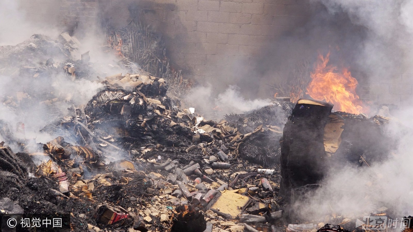 8时59分,距离着火现场最近的新民消防中队率先到达现场展开灭火工作。此时,大火已将仓库屋顶烧穿,滚滚浓烟直冲云霄。9时10分许,前来增援的名山、城站、特勤中队官兵陆续到达现场参与救援工作。9时45分,火灾得到有效控制。10时20分,明火被扑灭,消防官兵开始进行翻垛清理火灾现场。