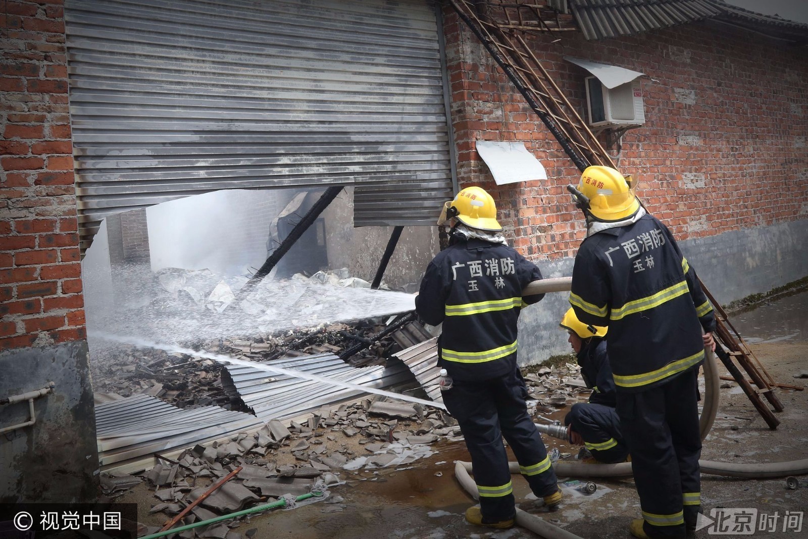 | 8月18日上午8时53分,广西玉林市城西卫生院附近一个堆放杀虫剂、饮料等物品的仓库突发大火。接警后,当地消防部门立即调集4个消防中队14辆消防车66名官兵赶赴现场处置。经过近两个小时的艰苦奋战,大火被成功扑灭,毗邻的仓库免遭火劫。