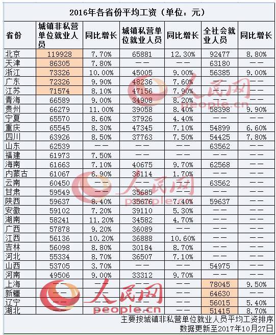 | (简真生活消费网讯)据人民网报道:目前,除西藏、黑龙江2地外,其余29省份均已公布2016年平均工资数据。与2015年相比各省职工收入不同幅度有所增加,但大多未超年度全国平均工资水平。以城镇非私营单位就业人员平均工资计算,北京职工年入近12万元居首,河南不足5万元垫底。 已发布职工平均工资信息的29省份中,上海、新疆、辽宁、湖北4省份仅公布了全社会平均工资,其他省份按城镇非私营单位职工和私营单位职工平均工资分别通报。各省份公布的数据并不完整。