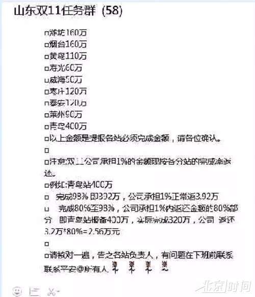 聊天截图还列出任务量完成度对应的返还现金的比例,完成任务额越少返现比例越小。天猫家装e站济南站一位财务人员称,2016年11月11日,他们实际签了一单,成交额是86000元。 “关于近期拍单是为了把名品包销售额提前往线上导,目的很明确,我们要完成3亿的交易量获得更多的流量。”一份聊天记录截图明确说明了拍单的四个阶段,提出要在11月10日统计每个拍单旺旺号第四阶段所需金额,提前在支付宝留够余额,从而在11月11日0点0分至0点30分之间迅速做到2亿以上的交易额,这意味着几十倍几百倍流量的增加。