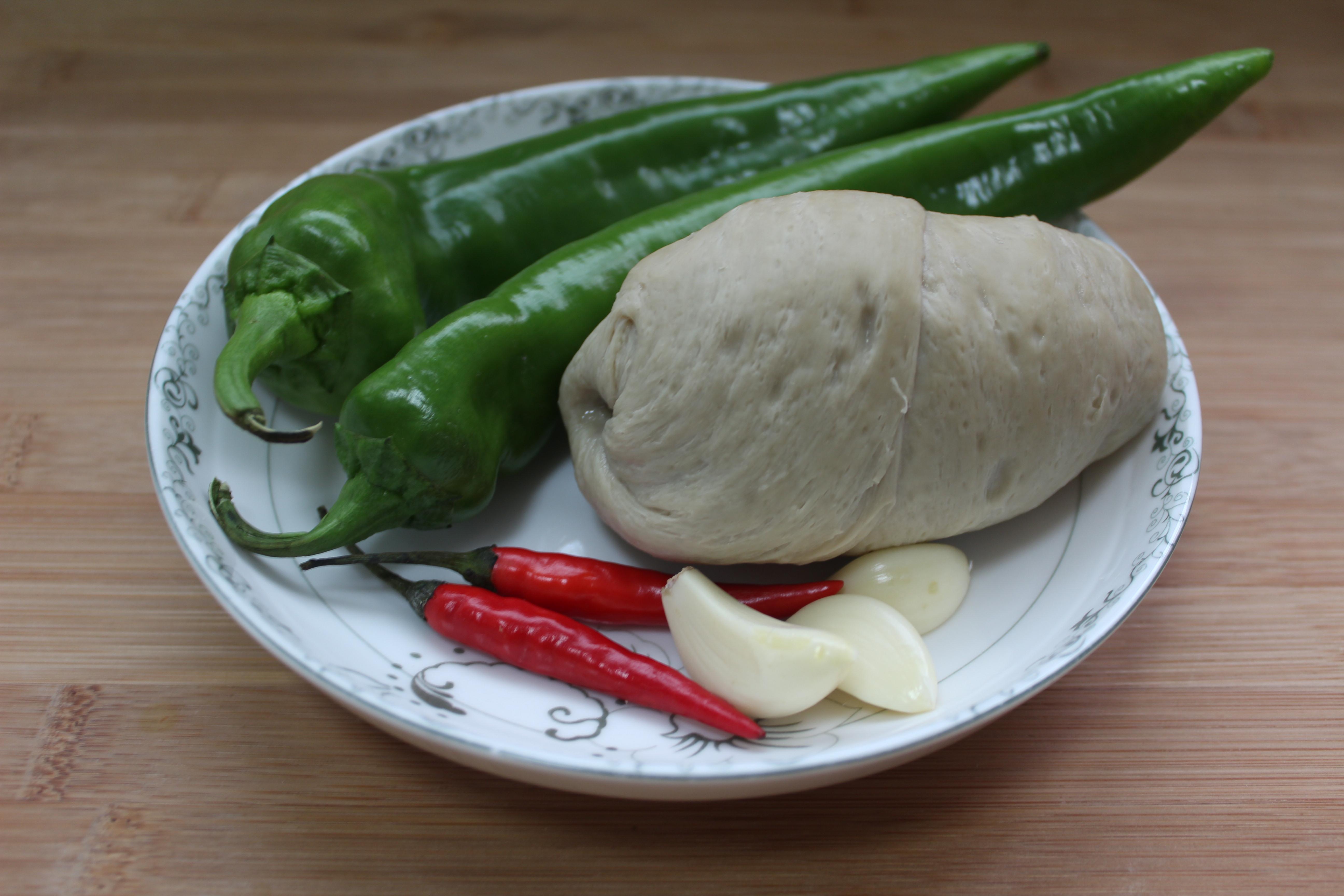 食材:面筋1块、尖椒2根、小米椒2根、蒜粒3个、盐半勺、生抽2勺。 做法: 1、食材备好。