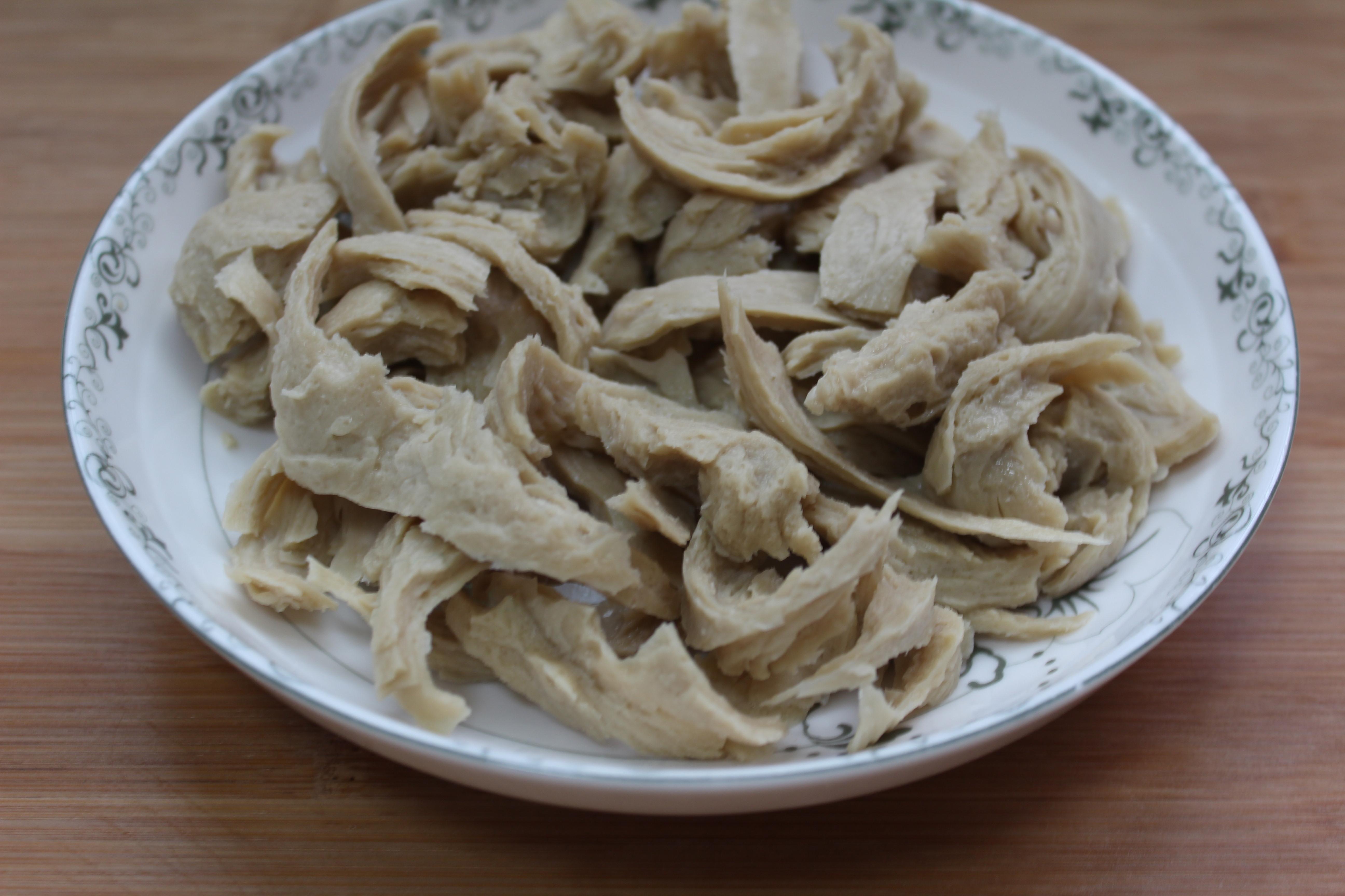 2、首先把面筋冲洗干净,用手撕成小片状。