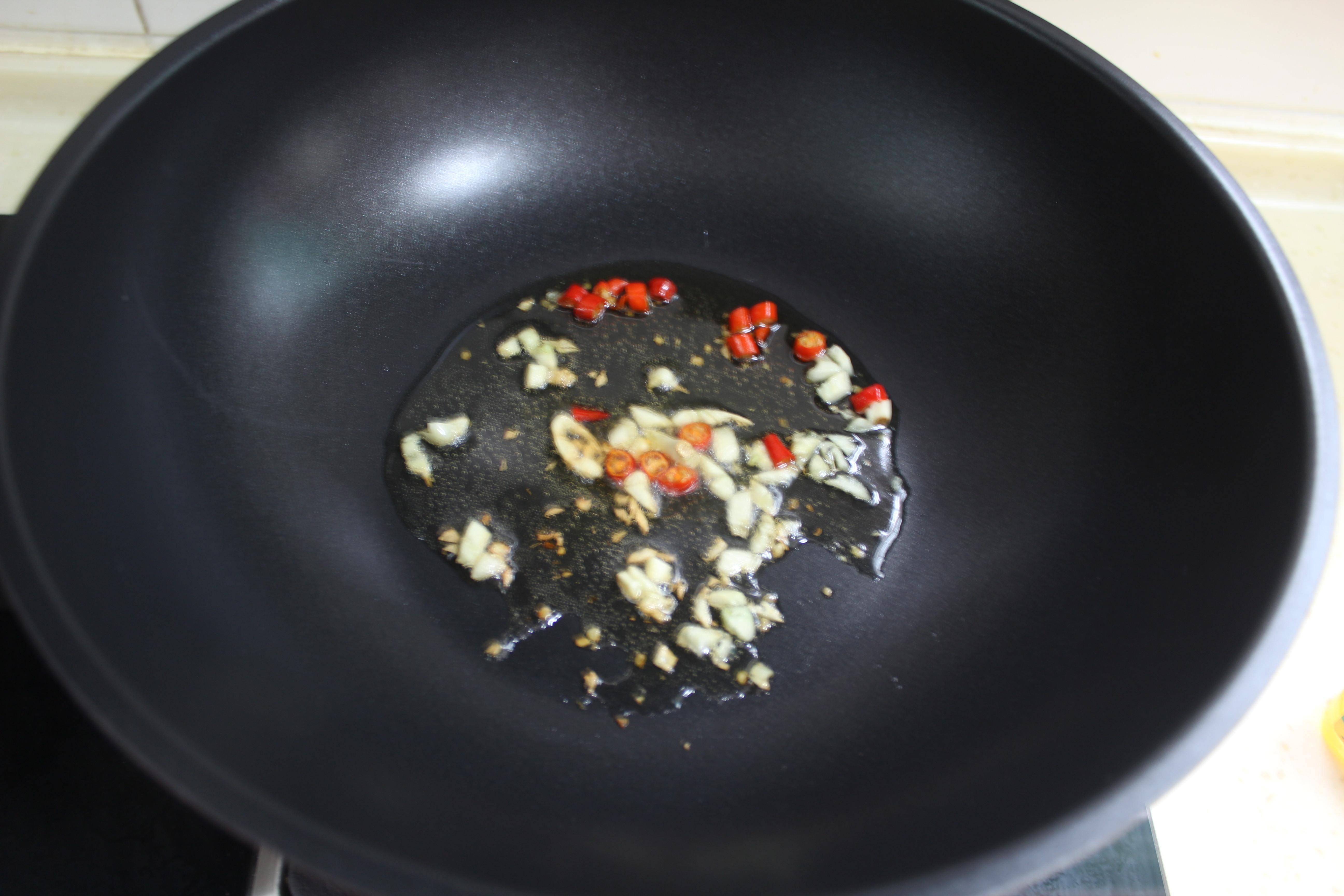 5、锅里放油,把小米辣蒜碎炒五六秒钟。