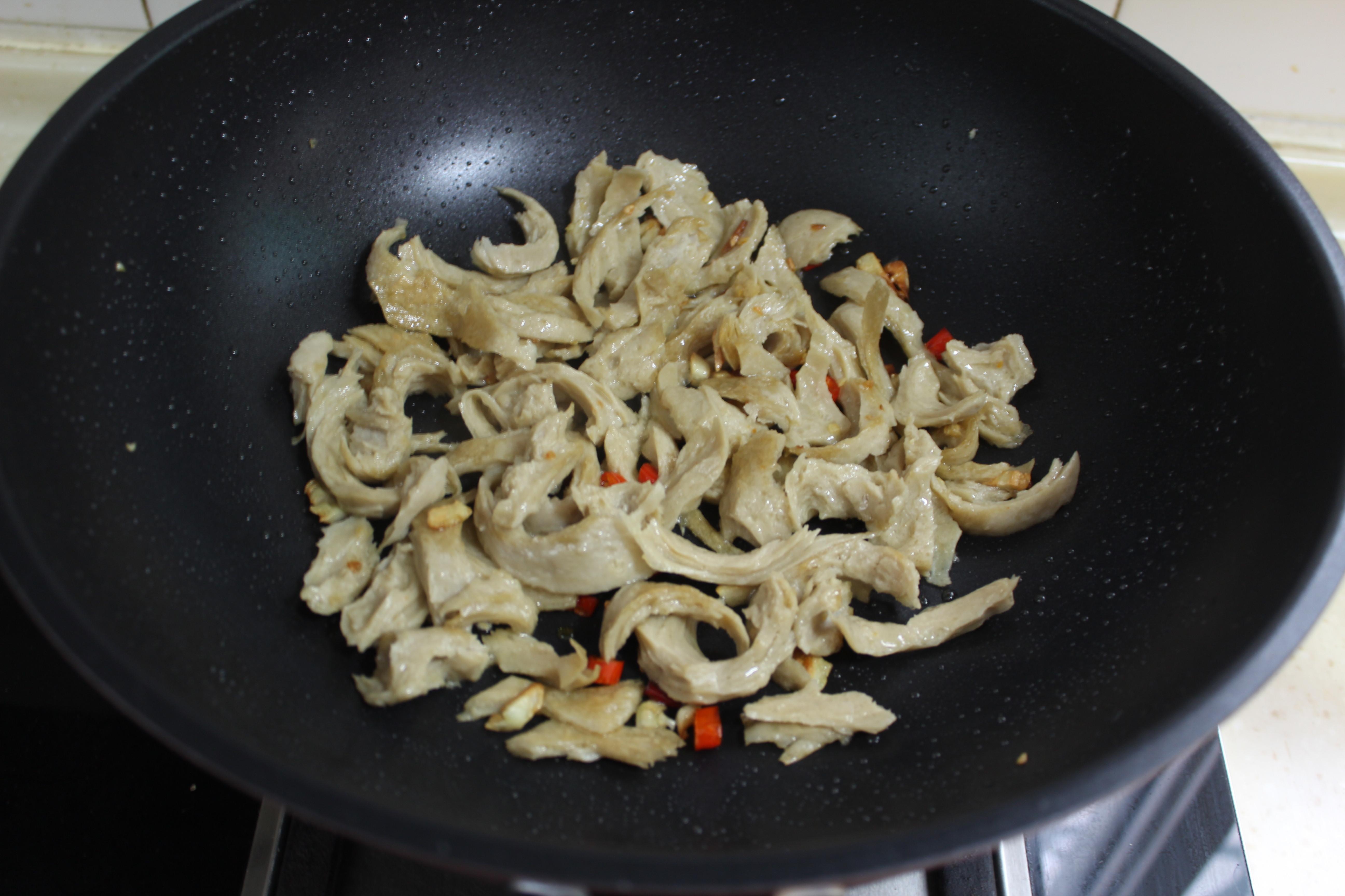6、把面筋卷放入锅里翻炒,炒至面筋稍黄。