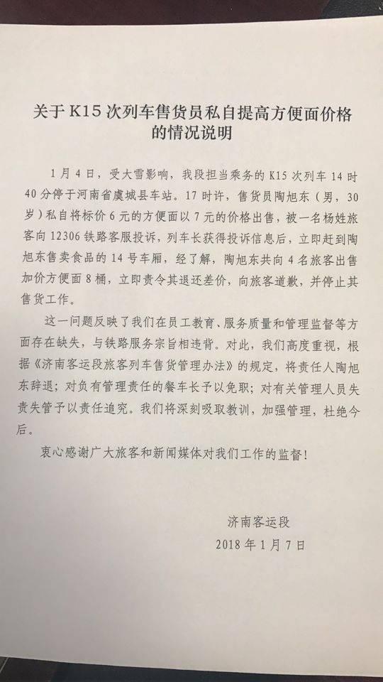 1月7日,中国铁路总公司济南客运段针对此事作出情况说明。1月4日14时40分,K15列车受大雪影响停靠在河南省虞城县,下午17时,售货员陶某私自将标价6元的方便面以7元价格出售,一共向4位乘客卖出加价方便面八桶。列车长收到投诉信息后,已责令陶某退还差价并向乘客道歉,并停止其售货工作。济南客运段根据相关规定,将责任人陶某辞退,对负有管理责任的餐车长予以免职,对有关管理人员失责失管予以责任追究。 |