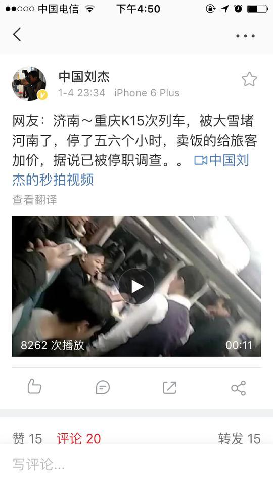 | 1月4日晚,网友爆料称,当天从济南发往重庆的K15次列车因为大雪在河南境内停运,售货员加价向乘客出售餐品。1月7日,济南铁路局发出情况通报,将涉事售货员辞退。 发布信息的网友表示:“济南~重庆K15次列车,被大雪堵河南了,停了五六个小时,卖饭的给旅客加价,据说已被停职调查。”视频中可以看到,一位乘务员模样的青年男子正在和一位中年男子乘客交谈,中年男子正在打电话,但由于车厢内比较嘈杂再加上视频时长较短,只听清了“你还在这里加价”一句话。