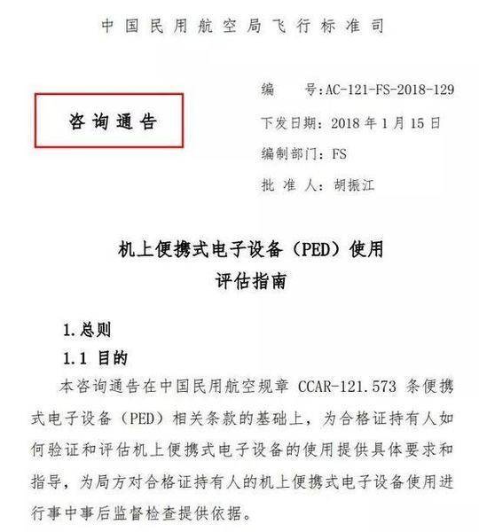 16日,中国民航局正式发布了《机上便携式电子设备(PED)使用评估指南》,指南指出: 合格证持有人可根据CCAR-121部第121.573 条“便携式电子设备的禁用和限制”(b)(5)款“合格证持有人认为使用时不会影响飞机导航和通讯系统的便携式电子设备”(如:笔记本电脑、平板电脑、手机等)确定便携式电子设备的开放使用。 如需要,合格证持有人应对特定便携式电子设备使用情况验证后决定是否开放使用。 虽然PED使用评估指南发布,但并不是乘客可以完全自由在飞机上使用手机。 《指南》规定: 合格证持有人在其所运营的飞机上开放机上PED使用前,应建立相应的使用规范,内容包括明确可用的PED种类;可用/禁用的飞行阶段等。 就在PED使用评估指南发布之后,东航、海航、祥鹏、春秋航空分别宣布,乘客将可以在空中使用手机,但需设置为“飞行模式”。