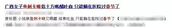 喝醋、吃饭等“土方法”有用吗? “土方法”之喝醋 基本无用! 有的人被鱼刺卡住后拼命的喝醋,认为醋可以溶解由钙构成的鱼刺,从而达到软化鱼刺的目的,软化的鱼刺就会从组织上脱落下来。真的是这样吗? 鱼刺成分是钙,醋能与钙发生反应,鱼刺遇醋会软化直至溶解。但是…… 我们食用的醋的有效成份是醋酸,化学名称叫乙酸,一般一瓶食用醋乙酸含量为4%—6%,含量如此之低,所以它要软化鱼刺需要漫长的时间和持久的浸泡。