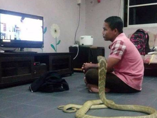 | 据最近在Facebook上疯传的一篇文章称,一名因女友之死而伤心欲绝的男子爱上了一条10英尺(约3米)长的眼镜蛇,他认为这条眼镜蛇是他失去的伴侣的转世。 这位男子名叫Worranan Sarasalin,生活在泰国北碧府。在过去的几年里,他和女友形影不离,从看电视到去健身房,一起做着每一件事。