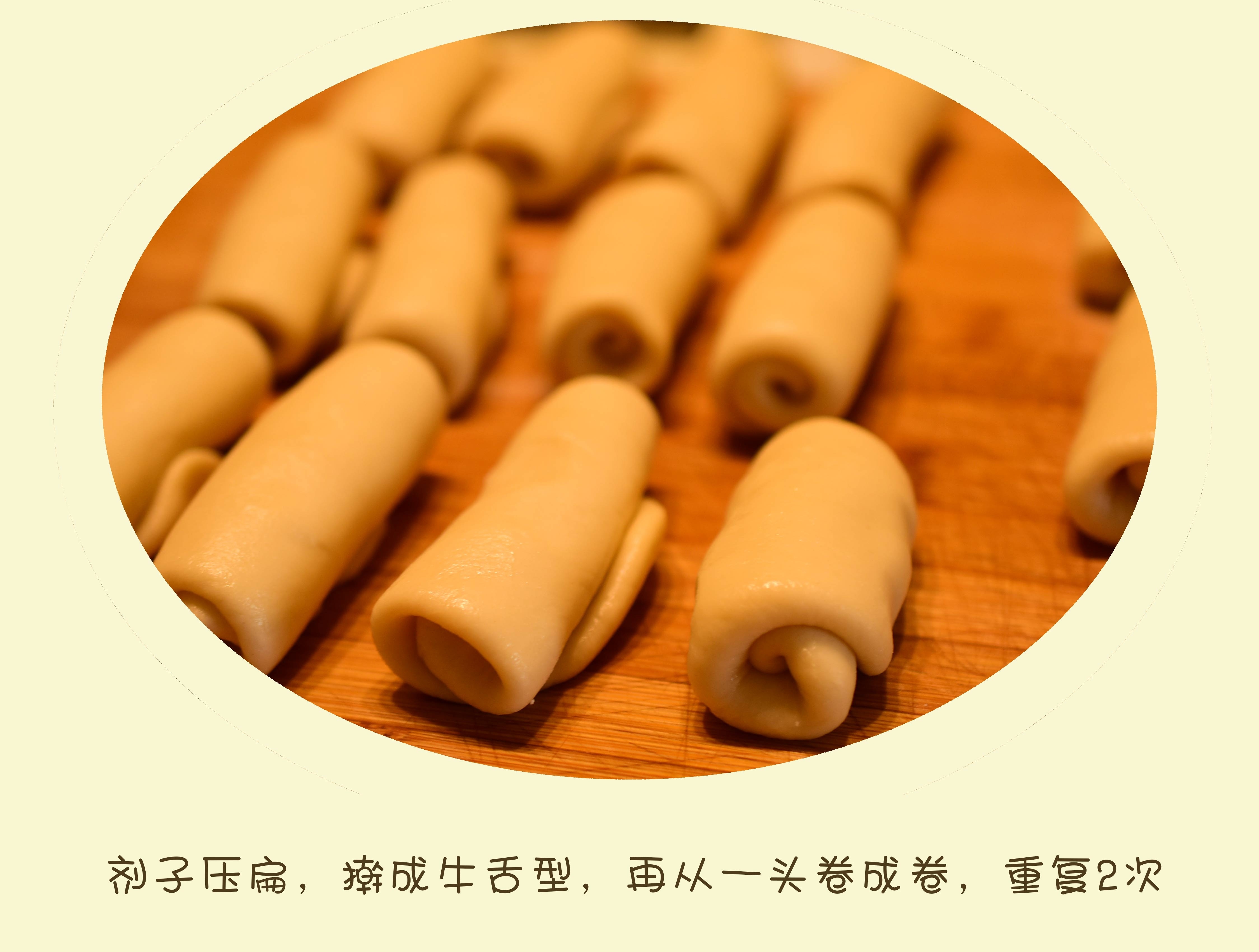 3,剂子压扁,擀成牛舌型,再从一头卷成卷,重复2次