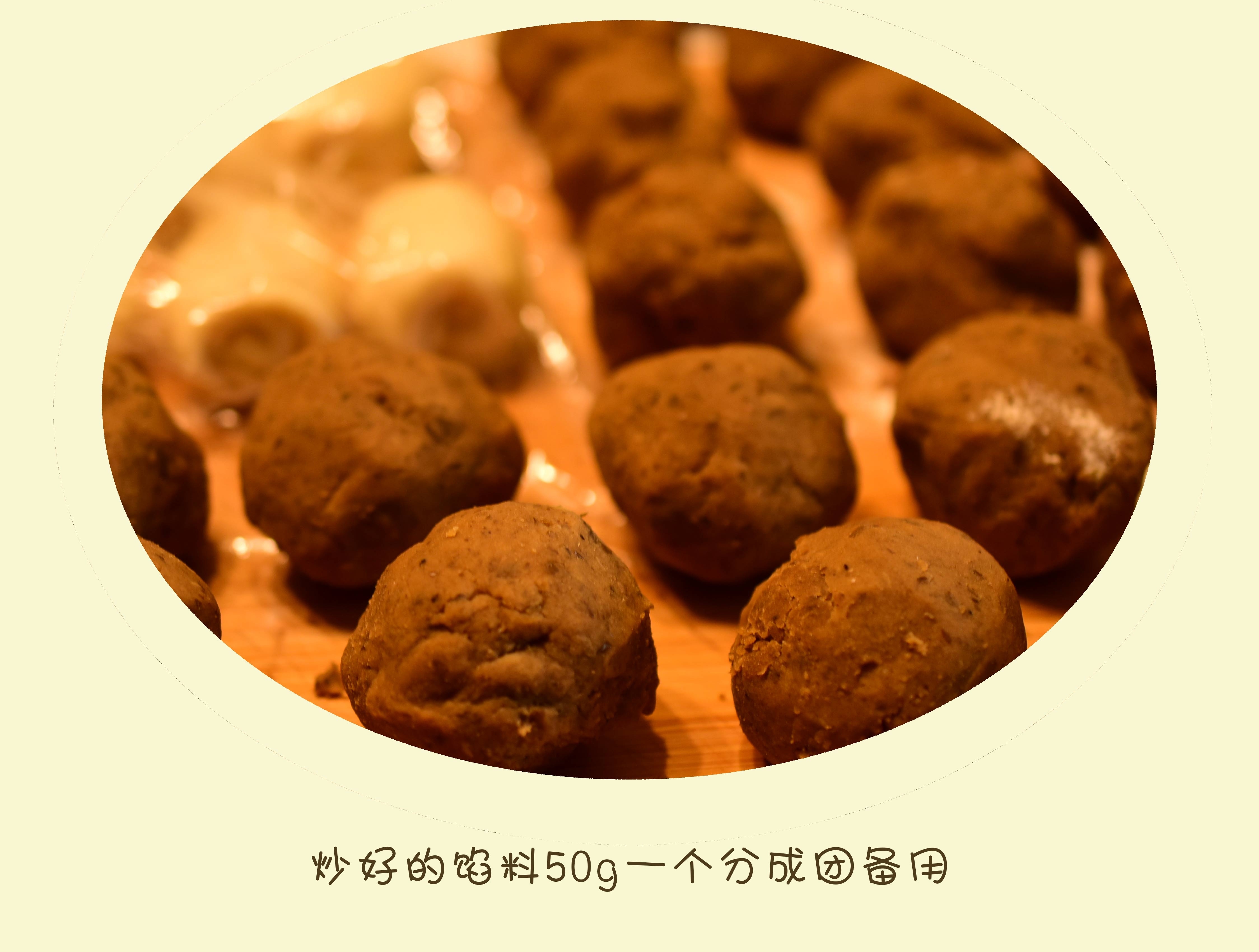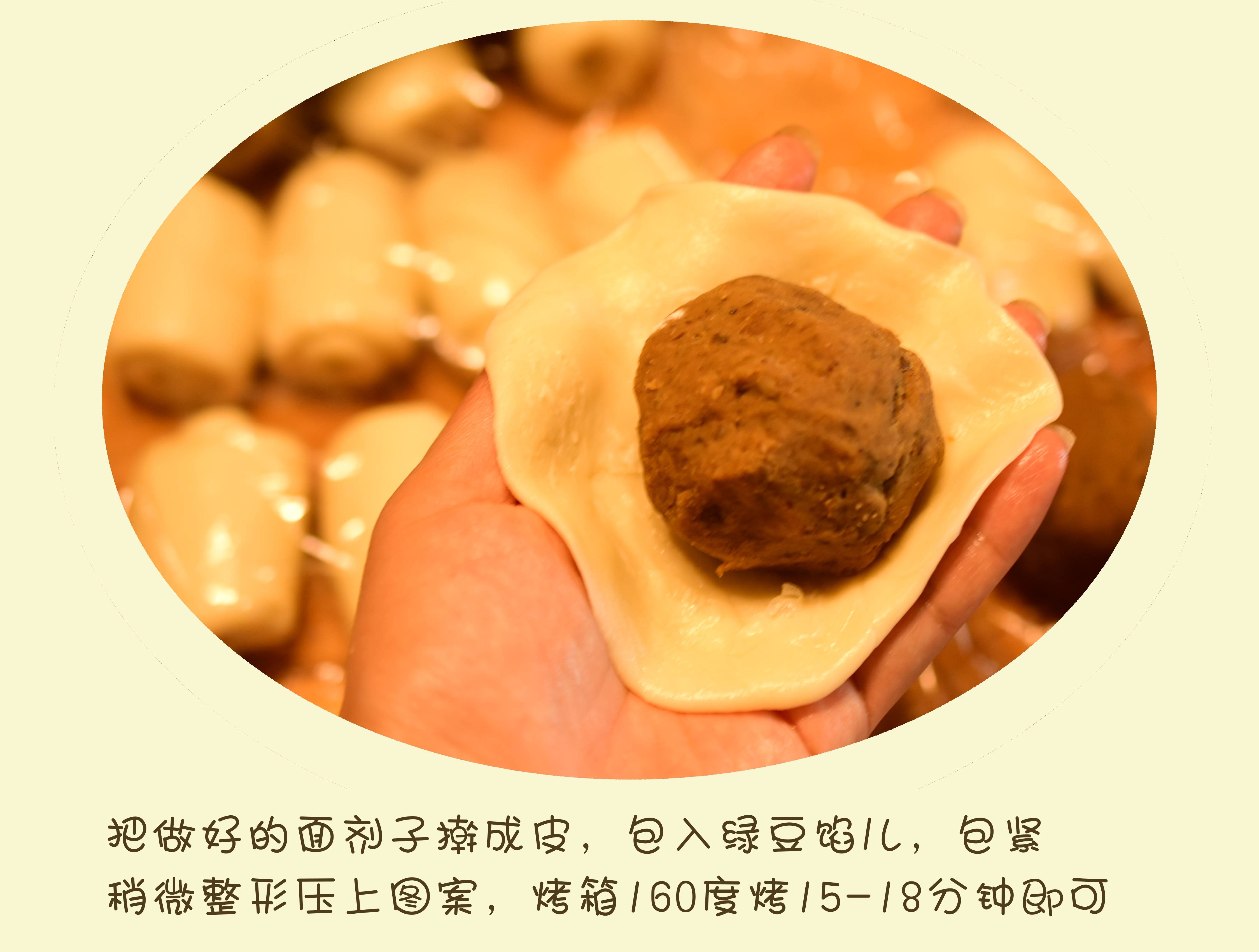 包和烤 1,把做好的面剂子擀成皮,包入绿豆馅儿,包紧,稍微整形压上图案,烤箱160度烤15-18分钟即可