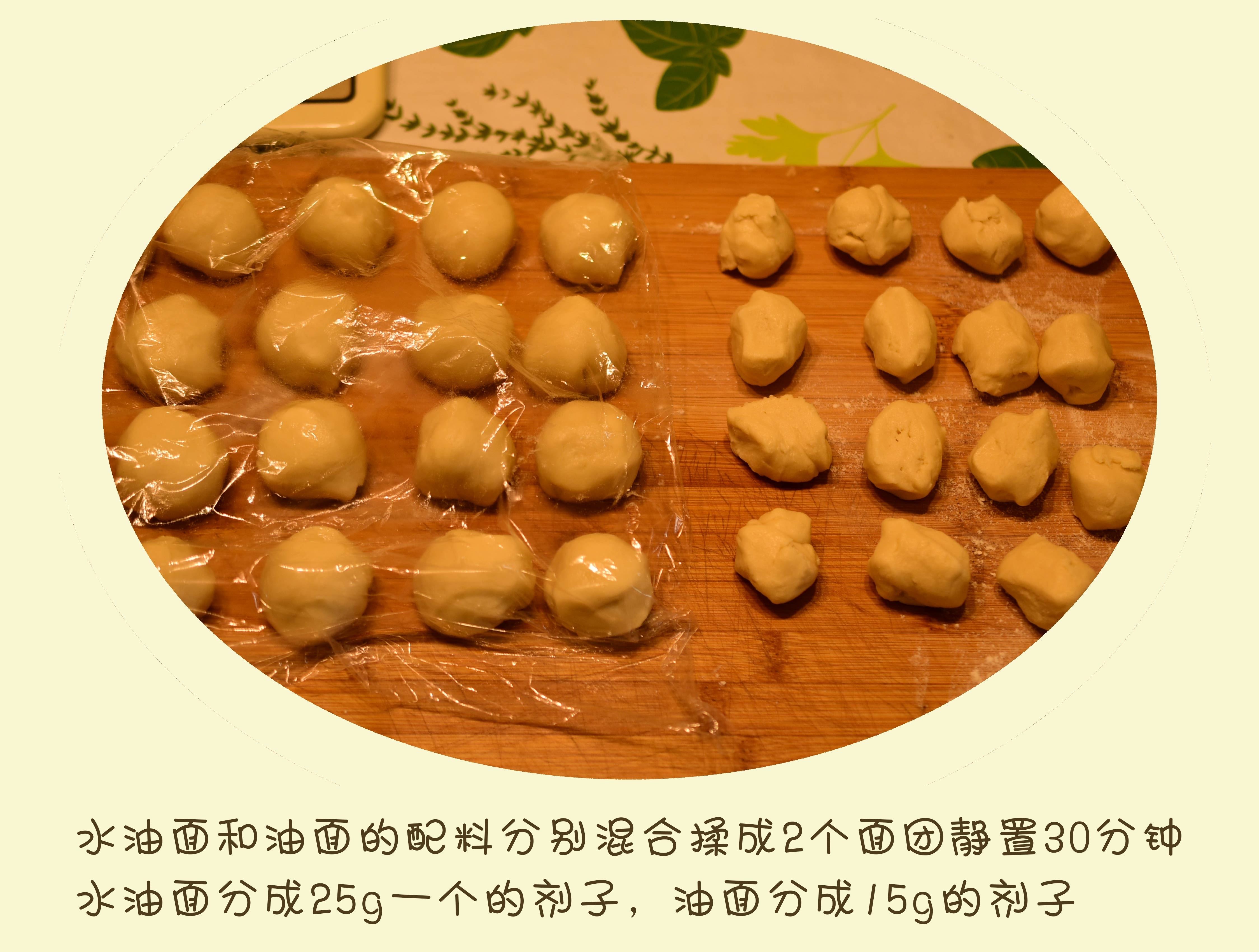 酥皮 水油面:低粉300g,水170g,猪油30g 油面:低粉200g,猪油100g 做法 1,水油面和油面的配料分别混合揉成2个面团,静置30分钟,水油面分成25g一个的剂子,油面分成15g的剂子