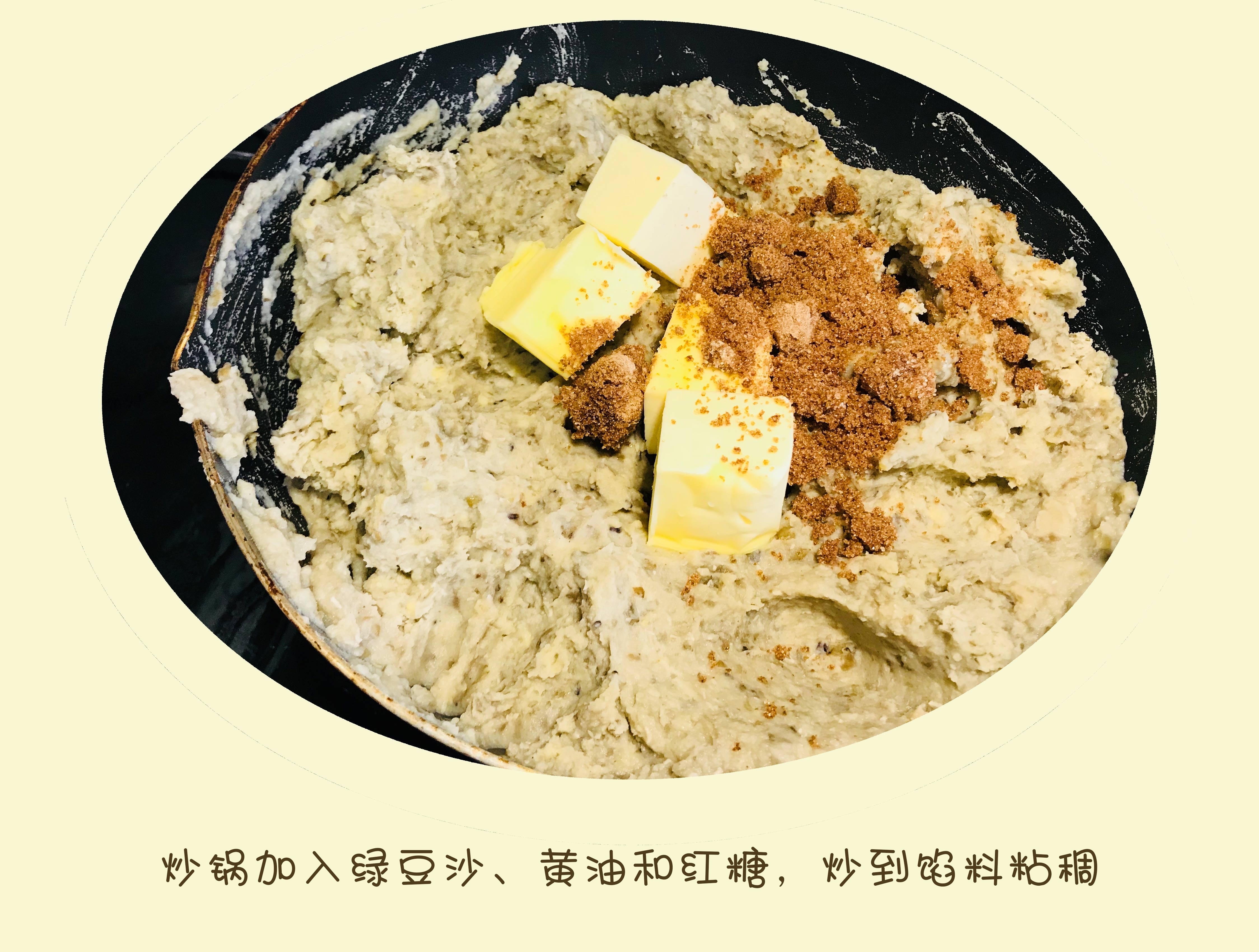 2,炒锅加入绿豆沙、黄油和红糖,炒到馅料粘稠
