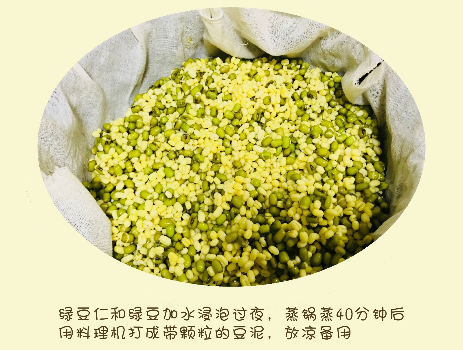 内馅儿 材料: 绿豆仁300g,绿豆100g,黄油150g,红糖100g 步骤: 1,绿豆仁和绿豆加水浸泡过夜,蒸锅蒸40分钟后用料理机打成带颗粒的豆泥,放凉备用