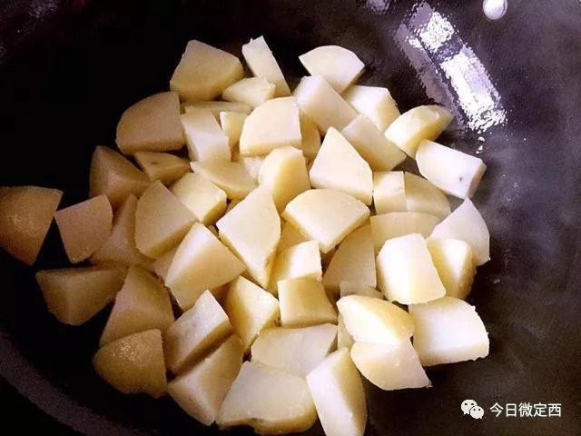 3、锅内放入少许芝麻油,将煮熟的土豆放入锅中,中小火煎。