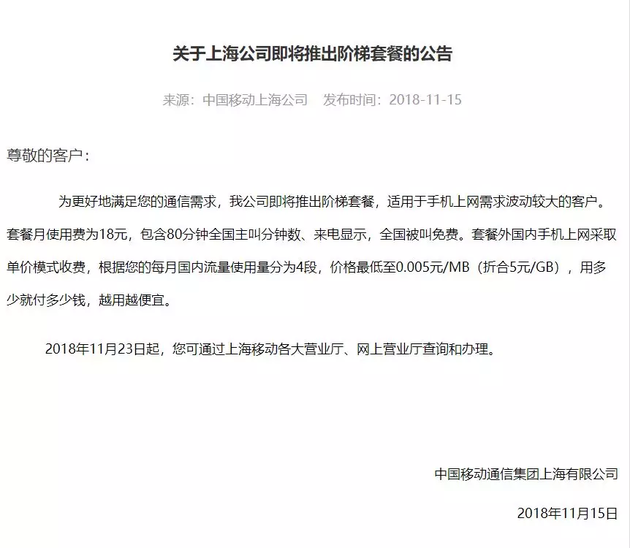 电信行业分析师马继华对每日经济新闻(微信号:nbdnews)表示,从上海移动的“18元/月新套餐”来看,阶梯定价意味着该类型手机套餐内将不再赠送手机流量,只赠送免费语音。阶梯式定价在我国电、水、燃气等方面早已经采用,不过采取的方式是“拾级而上”的方式,使用量越高,单价越贵。而手机流量则是“拾级而下”的方式,用户使用量越多、单件越便宜。 电信分析师付亮对每日经济新闻(微信号:nbdnews)记者表示,之所以会造成这种差别,在于通信、互联网强大的共享性决定的,随技术进步而近乎无限放大供给量,释放了技术红利。 如今,用户打电话发短信越来越少,流量的支出越来越高,流量也成为三大运营商的主要利润来源。根据工信部公布的最新数据,截止到今年9月份,国内手机户均移动互联网接入流量已经突破了5GB。流量经营也成为运营商的主竞争方面,推出了诸如大流量套餐卡,互联网应用免流量卡等等多种玩法。 不过,18元/月的套餐并没有提及套餐内增送免费的流量。有业内人士对记者表示,正式的套餐具体细则还没有公布,相关新套餐内是否赠送流量还存在模糊,还要看具体的推进情况。 那么,“阶梯式流量”是否划算? 假设一位用户一个月用20G流量,即便以“阶梯式流量”最便宜一阶的5元/GB来计算,则需要支付流量费100元,这种计费方式,明显高于中国移动增送20G流量的大流量系列套餐。而且,中国电信、中国联通早已经有了1元G、1元1天无限量套餐等更刺激用户的方式。 电信分析师付亮对每日经济新闻(微信号:nbdnews)记者表示,现在的流量阶梯定价仅适用于流量使用较少的用户,亦或者上网需求波动较大的客户使用,其他大量的日租卡、大流量套餐的资费会更便宜。 3年前已有尝试 实际上,三大运营商在2015年已经在“阶梯式流量费”方面做了尝试。比如: 用户流量使用0到100M之间,单价为0.15元/M; 100到500M之间,单价为0.08元/MB。 不过,当年手机流量套餐还在1元10M的阶段,1G流量则需要近乎百元的成本。 由于计费方式过于复杂,用户流量使用增长较快。2015年运营商推出的手机流量阶梯定价,反响平平,后来不了了之,业内人士印象也不太大。