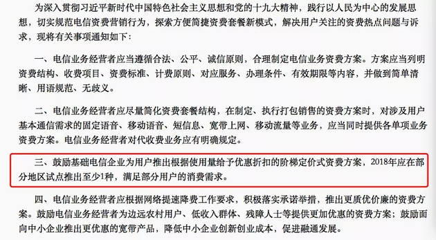 图片来源:视觉中国 电信行业人士金峰认为,尽管从广义角度而言,国内运营商之前已有了“阶梯式定价”的多种实践,但与用户期望仍有差距。 第一,套餐台阶高度固定,单价没有越来越低; 第二,应用范围狭窄,比如只限于在国内使用; 第三,需要单独订购。 而今年的这一次试点,是工信部在8月份发文鼓励之后,三大运营商首次正式推出流量阶梯套餐业务模式。此前工信部表示:鼓励基础电信企业为用户推出根据使用量给予优惠折扣的阶梯定价式资费方案,2018年应在部分地区试点推出至少1种,满足部分用户的消费需求。