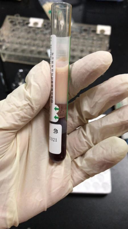 | 31 岁的陈女士家住湖北武汉市后湖,生完宝宝后体重一直没降,目前体重有 170 斤。 今年过年期间,家里采购了很多花生、瓜子、糖果、坚果等零食,陈女士没事就和家人坐在一起,边看电视边吃瓜子唠嗑,一天到晚零食不离嘴。 连着吃了几天后,陈女生在家中突然感到腹部胀痛,被家人赶紧送到武汉市中心医院后湖院区就诊。 抽血时发现,陈女士原本红色的血液竟然分为两层,上层变成牛奶状的乳白色,这是高血脂导致的 " 乳糜血 " 现象。