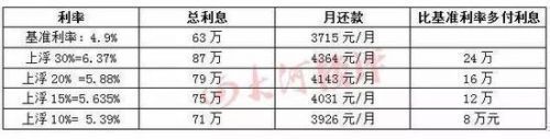 据当地居民反应,目前郑州多家银行利率普遍上涨10%~20%,且房贷放款较慢。 今日,记者实地走访了工、农、中、建、交五大行以及浦发、民生、中信等银行,发现不仅利率普遍上浮,有的甚至达到30%。 “我在西郊买了一套房,几个月了,到现在银行还没有放款,且利率上浮了15%,30年下来多花十几万。”市民王先生向记者爆料称,目前郑州很多银行利率都上浮了很多。 其中,中国银行和交通银行上浮最多,达到了20%;农业银行、建设银行均上浮15%;工商银行上浮最少,为10%。商业银行方面,中信银行上浮较多,达到30%;浦发银行则在今年3月份就已经停贷了;华夏银行目前仍上浮10%。 目前基准利率为4.9%。记者算了一笔账,若一套房按总价100万元,首付30%,贷款70万元,分30年采用等额本息还款来算。利率上浮30%,每月需要多付650元,总利息达到87万元,比基准利率多付24万元;如果利率上浮20%、15%、10%,则利息分别需要多付16万元、12万元和8万元。(来源:大河报)