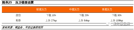 五大行加12家股份制银行这17家银行中,中信银行、邮储银行和兴业银行涉房贷款占比最高,广发银行、华夏银行和广发银行则最低。 3、银行究竟能承受房价下跌多少? 测试结果显示,在房价下跌,利率上调的情况下,银行贷款不良率显著上升。