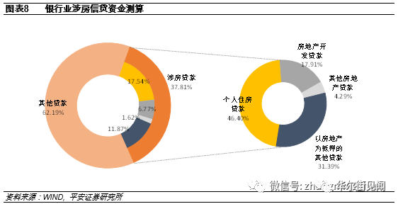 在这个过程中,房地产泡沫在逐渐膨胀,其中的金融风险也在逐渐累积:多个城市的房价创历史新高,居民住房贷款的攀升大大提升了居民部门的杠杆率;而房地产作为资本密集型行业,又与银行业深度捆绑,致使房价持续攀升的过程中,银行业也承受了巨大的压力。 当前中国房地产行业所蕴含的高风险有目共睹。虽然房地产在国民经济中的重要地位决定了官方不会袖手旁观,但在防风险、去杠杆的金融监管主题下,官方对于房地产泡沫的容忍度在显著降低。 因此,我们有必要探讨当前银行及金融行业在多大程度上被房地产所“绑架”,以及房地产行业一旦发生风险暴露,可能给银行业及金融市场带来的连锁负面影响。 2、银行被房地产“绑架”了多少? 银行涉房贷款主要包括两个方面,一是与房地产直接相关的贷款,包括个人住房贷款、房地产企业开发贷款等;二是以房地产作为抵押物的其他贷款,包括地方官方及其他非房地产企业以土地或房产作为抵押物获得的银行贷款。