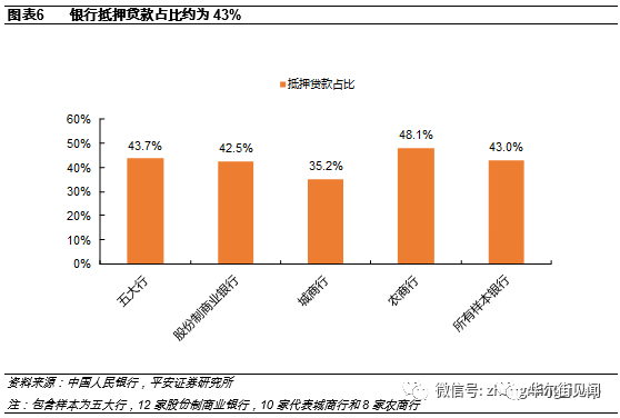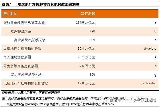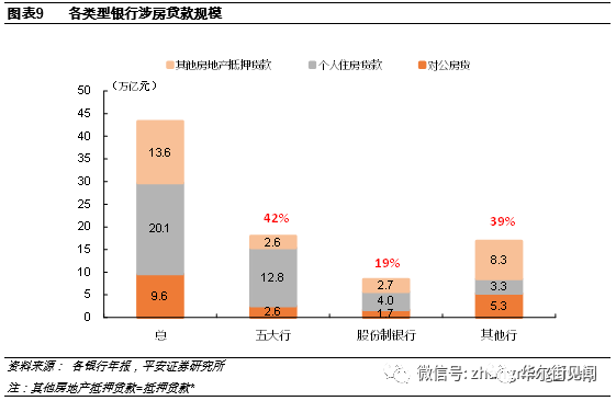 2、以房地产作为抵押物的其他贷款 根据对四大行、13家股份制银行、10家城商行和8家农商行的数据统计,抵押贷款约占商业银行贷款总额的43%,其中绝大多数抵押物为土地或者房产。由此我们测算,以房地产作为抵押物的贷款规模约为39.4万亿元,剔除以房地产作为抵押物的直接涉房贷款,可得出以房地产为抵押物的其他贷款规模约为13.6万亿。