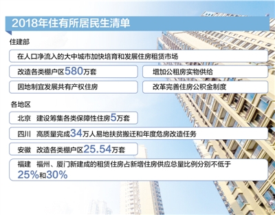 4个月,179个拟售在售和已售楼盘,是否存在擅自预售商品房、未按规定公示商品房销售方案、发布不实价格和销售进度消息诱骗抢购等30项违法违规行为……2016年末,湖北武汉集中整治房地产市场,圈定了专项检查范围。在各楼盘现场,市区两级房管执法人员持证执法。对违法违规行为,房管部门责令整改,逾期不改的,由监管部门关闭网签通道,楼盘就卖不成了。 2017年以来,全国范围加大了房地产市场秩序规范整顿力度,严厉打击房地产企业和中介机构违法违规行为。2018年,如何坚持房子是用来住的、不是用来炒的定位?怎样完善平稳健康发展的长效机制?带着沉甸甸的问题,湖北住建厅厅长李昌海近日参加了住建系统的一次全国性会议。 "5年来成就令人瞩目,同时也必须清醒看到,我们的工作还存在许多不足……住房供需存在结构性矛盾,租售结构不合理,新就业职工、外来务工人员等新市民群体住房问题比较突出。"李昌海说,住建部部长王蒙徽在会上的这段话,"让我感受最深。" 去年,我国房地产市场调控效果持续显现,一线、部分热点二线城市房价涨幅回落,三四线城市房价趋于稳定。上海市住建委主任黄永平参加讨论后表示,一些同志建议:在坚持调控目标不动摇过程中,既要坚持和完善行政手段,还要探索更多综合运用市场的手段和方法。 2018年,无疑还需保持当前严厉的调控态势。手段上,针对各类需求实行差别化调控政策,满足首套刚需、支持改善需求、遏制投机炒房;库存仍然较多的部分三四线城市和县城要继续做好去库存工作。此外,还将加强市场监测分析,提高精准调控的能力和水平,进一步强化地方政府主体责任。举措上,加强区域协调和城乡统筹,促进大中小城市互联互通,提高中小城市、县城和中心镇的教育、医疗等基本公共服务水平,引导人口和住房需求合理分布。 最近,万科泊寓北京天坛店开张营业。这个长租公寓半年起租,套内面积从15平方米到40平方米不等,家具家电一应俱全,还会举办读书会等活动。在我国,租房一直是个让人操心的事。但近两年长租公寓兴起,提升了租房吸引力。 2018年,一系列措施将助力补足租赁短板:在人口净流入的大中城市加快培育和发展住房租赁市场,推进国有租赁企业建设,充分发挥对市场引领、规范、激活和调控作用;同时,支持专业化、机构化住房租赁企业发展,加快推进住房租赁立法,保护租赁利益相关方合法权益。 做强租赁、租购并举的同时,如何在"多主体供给""多渠道保障"上下足功夫? 供给将更加多元。因地制宜发展共有产权住房,多渠道解决群众住房问题。近日,北京市海淀区某共有产权住房项目开始申购登记,按规定,购房人产权份额比例为70%,房价也低于市场平均水平--含全装修费用销售均价35000元/平方米。北京明确,5年内将供应25万套共有产权住房。 保障将更加有力。今年,我国还将改造各类棚户区580万套。同时,增加公租房实物供给,不仅要优先保障环卫、公交等行业困难群体,还要将符合条件的新就业无房职工、外来务工人员和青年医生、青年教师等纳入保障范围,对低保、低收入住房困难家庭,更要应保尽保。 无论租或购,城乡面貌关系居住品质。2018年城乡人居环境的画卷值得期待。住房质量更为改善。在城市,老旧小区改造试点将深入开展,更多老房子将焕发青春;在农村推进建档立卡贫困户等重点对象危房改造。 市容村貌更整洁。看城市,全面推进海绵城市建设、城市生活垃圾分类,因地制宜推进地下综合管廊建设,加强城镇污水和垃圾处理设施建设。看农村,实施农村人居环境整治3年行动,继续推进农村生活垃圾治理,大力推动农村户厕建设和改造。 内蒙古住建厅有关负责人参加讨论后表示,为了制定更有针对性的政策,大家提出不少建议:对人口净流入城市和人口净流出城市,体现政策区别;边疆落后地区在棚改、老旧小区改造、既有建筑节能改造、农村危房改造及城市基础设施建设支持方面,能够体现政策倾斜等。
