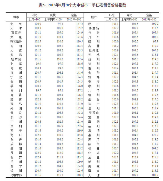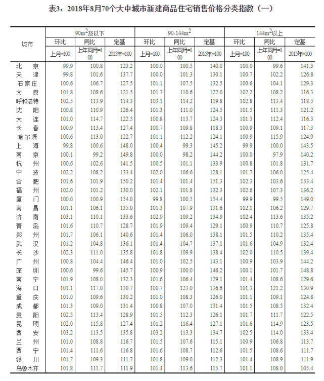 | 国家统计局今日发布了2018年8月份70个大中城市商品住宅销售价格变动情况统计数据。对此,国家统计局城市司高级统计师刘建伟进行了解读。 一、一二线城市商品住宅销售价格变动总体平稳 8月份,各地继续坚持因地制宜、因城施策、综合调控,努力促进房地产市场平稳健康发展。据初步测算,4个一线城市新建商品住宅销售价格环比上涨0.3%,涨幅比上月略微扩大0.1个百分点;同比上涨0.9%,涨幅比去年同月回落4.1个百分点;1-8月平均,同比下降0.1%,而去年同期为上涨14.6%。二手住宅销售价格环比由上月上涨0.2%转为持平;同比上涨1.2%,涨幅比去年同月回落6.4个百分点;1-8月平均,同比上涨0.5%,涨幅比去年同期回落15.9个百分点。 31个二线城市新建商品住宅销售价格环比上涨1.3%,涨幅比上月扩大0.2个百分点;同比上涨8.6%,涨幅比去年同月扩大0.6个百分点;1-8月平均,同比上涨6.2%,涨幅比去年同期回落5.3个百分点。二手住宅销售价格环比上涨1.3%,涨幅比上月扩大0.3个百分点;同比上涨6.5%,涨幅比去年同月回落1.0个百分点;1-8月平均,同比上涨4.9%,涨幅比去年同期回落4.4个百分点。 二、三线城市商品住宅销售价格有所上涨 35个三线城市新建商品住宅销售价格环比上涨2.0%,涨幅比上月扩大0.5个百分点;同比上涨8.3%,涨幅比去年同月回落1.0个百分点;1-8月平均,同比上涨7.0%,涨幅比去年同期回落1.2个百分点。二手住宅销售价格环比上涨1.4%,涨幅比上月扩大0.3个百分点;同比上涨6.4%,涨幅比去年同月回落0.1个百分点;1-8月平均,同比上涨4.9%,涨幅比去年同期回落0.4个百分点。 三、15个热点城市新建商品住宅销售价格有涨有跌 8月份,15个热点城市新建商品住宅销售价格环比下降的城市有1个,比上月减少1个;持平的2个,与上月相同;上涨的12个,增加1个,最高涨幅为3.4%。同比下降的城市有2个,比上月减少2个,最大降幅为1.6%;上涨的13个,增加2个,最高涨幅为10.2%。 重点城市数据概览 北京8月新建商品住宅销售价格指数环比持平(前值+0.2%),同比0.2%(前值+0.2%)。 上海8月新建商品住宅销售价格指数环比0.1%(前值-0.1%),同比-0.2%(前值-0.2%)。 广州8月新建商品住宅销售价格指数环比0.9%(前值+0.6%),同比3.3%(前值+1.6%)。 深圳8月新建商品住宅销售价格指数环比0.5%(前值+0.5%),同比0.3%(前值-0.7%)。 北京8月二手住宅销售价格指数环比持平(前值+0.4%),同比-2.6%(前值-3.5%)。 上海8月二手住宅销售价格指数环比-0.1%(前值-0.1%),同比-2.1%(前值-2.2%)。 广州8月二手住宅销售价格指数环比0.6%(前值+0.3%),同比2.5%(前值+1.9%)。 深圳8月二手住宅销售价格指数环比1.1%(前值+0.6%),同比6.9%(前值+5.6%)。