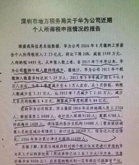 报告中显示,在深圳,从2015年下半年到2016年5月,华为公司缴纳个税的人数持续减少,从去年的7.29万降到了2016年一季度的6.3万人,而到五月份员工则减少到2.05万人。减少人员月均税额4000元,测算减少年度税源9.84亿元。 华为方面也证实,在这期间从深圳迁出了20300人。综合迁入迁出情况,2016年华为累积净迁出深圳11200人。 今年什么情况?查了下华为所在的龙岗区一季度经济数据。税收收入同比下降25.8%,看来,在2017年,华为还在跑。