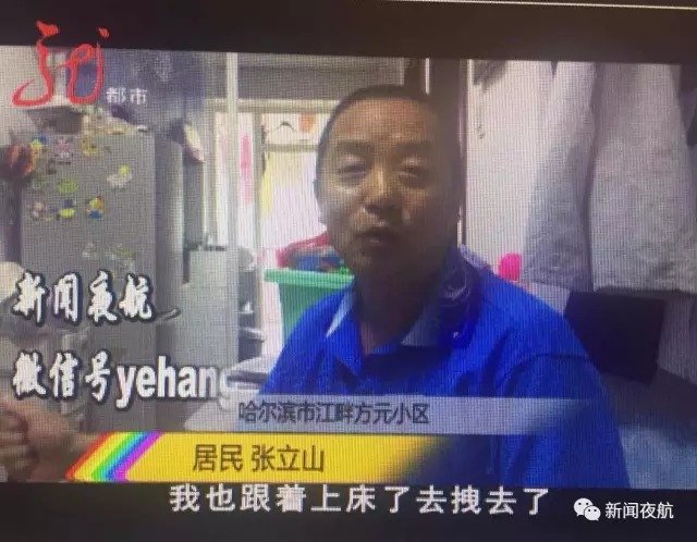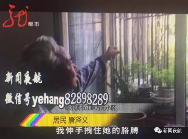 哈尔滨市江畔方元小区居民 唐泽义: 上去以后,我拽她胳膊,她的裤子穿的长裤,使劲拽她的裤子,我就喊快救人啊快救人啊,喊了有十来分钟吧,我说我不行啊,我坚持不了,我心脏不好啊,我说谁快来啊,楼下有个叫张立山的我们邻居,他五十多岁,他上来了。