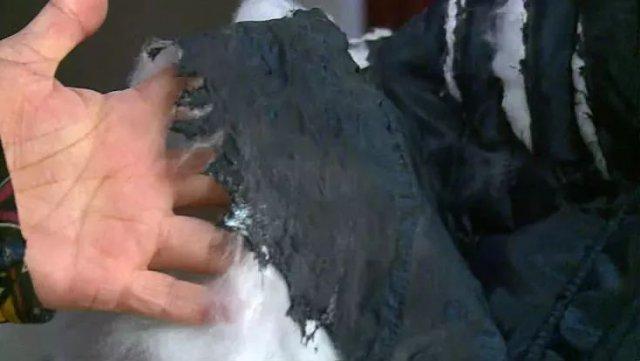 张大爷 我在里面整理行李,听到外面 " 嘣 " 一声很响很响的,我担心煤气爆炸起来,走出来什么都没有,她说吓死了,吓死了。 好端端的羽绒衣穿在身上怎么会爆炸?难道问题出在衣服上?老人也百思不得其解。按照张大爷的说法,他只是用塑料袋将电饭锅盖上,其他什么都没动,自己出来的时候还好好的。 难道是煤气泄漏引起的? 走进事发地点的厨房,一股子煤气味扑面而来,十分刺鼻。 可以看到除了羽绒服,煤气罐边上的毛巾和垃圾袋都有一定程度的灼烧。