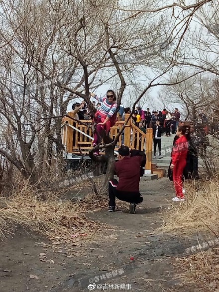 就这阵势,自拍不想跟路人合影都难! PS技术不好,P不掉路人,又想独自出现肿么办?这几位游人似乎有高招? 身手不错的几位直接爬树,来个仰拍,美景是有了,但是美颜就不一定了。