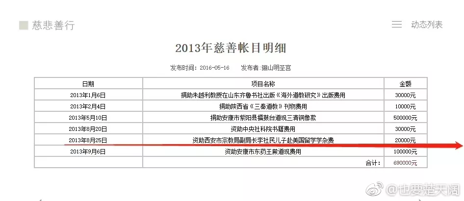 慈善捐款到底流向哪里一直是公众非常关心的问题,明圣宫能将自家慈善账目晒出来,做法值得表扬。 只不过……这"坦诚相见"也太"坦诚"了…… 连给副局长的儿子赞助美国留学费用都写出来了: 2013年的慈善记录显示,当年该慈善功德会给西安宗教局的副局长李社民的儿子资助了2万的"留美学杂费"。
