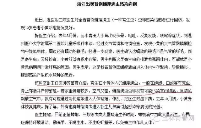 | 据报道,一名10岁女童发烧咳嗽连续一个月不见好,竟是因为拍死了蟑螂。经胸部CT检查,确诊为蠊缨滴虫感染。