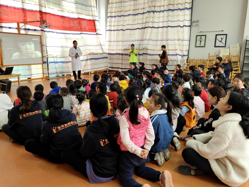 金声听力的陈医生为大家播放了一段爱耳公益视频视频,在观看过程中,小朋友们也跟着问社工:视频中的小朋友怎么了?在说什么,为什么没声音?社工告诉小朋友,视频中的小姑娘因为小时候发烧服用药物不当的原因,失去了听力,“虽然知道声音在自己的周围,但就是无法感知到”。据悉,我国有听力语言障碍的残疾人2057万,其中7岁以下聋儿可达80万,老年性聋949万;由于药物、遗传、感染、疾病、环境噪声污染、意外事故等原因,每年约新生聋儿3万余名。这需要社会多宣传爱耳防残的科学常识,家长应多学习这些知识并采取保护胎儿和婴儿顺利成长的措施,使儿童不受致残因素的影响。最后,陈医生还教授大家了一套耳保健操,希望大家在自己学会的同时,也能带回家中,提醒教授给自己的爸爸妈妈。