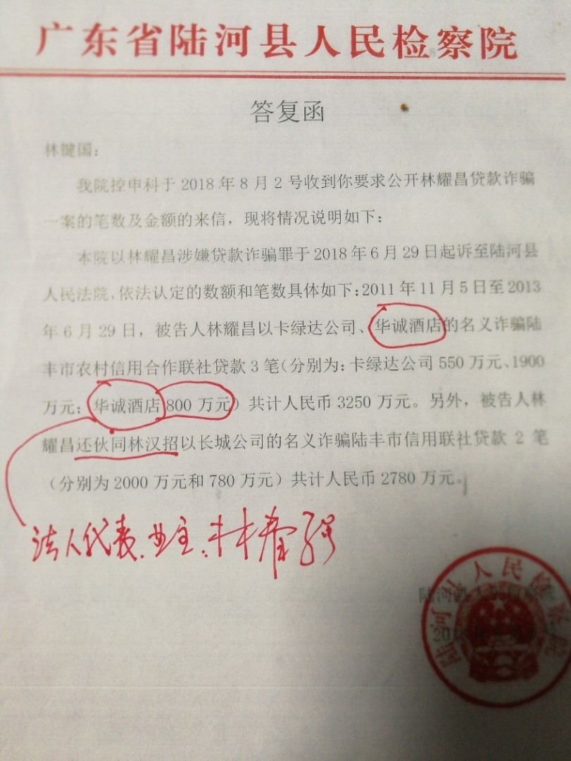 2016年11月17日,东莞市中级人民法院对林耀昌犯非法占用农用地罪、行贿罪一案作出终审判决:林耀昌判处有期徒刑四年,并处罚金人民币5万元。 林键国对时间财经说,即便“坟爷”最终被定了无期徒刑,关于破坏祖坟和祠堂的事,他绝不会放弃追责。“我无法向家族及先辈交代”,林键国说,因被挖掘的祖坟至今无法修复,案件破了,他才能向当地民政部门请求给予原位修复。 6000万贷款背后的阴影 本来事情到2016年“坟爷”领到四年刑期就结束了,一通电话又改写了命运。 上述判决之前,林耀昌曾给林键国打过的一通电话。威胁林键国的同时,还提到自己有多少产业多少钱,“贷款不到一个亿吧”。这句话在举报人林键国心里种下种子,他坚定了继续举报之路。 林键国告诉时间财经,“坟爷”从诈骗第一笔贷款的本金和利息已经逾期拒还之后,仍实施到第八笔贷款直至案发。合计数额为人民币7830万元。其中有几笔已归还,最终未还数5973万元。 2017年9月20日,林耀昌刑满释放当日,即被汕尾警方以涉嫌骗贷罪依法刑事拘留。2019年5月9日,林耀昌贷款诈骗案在汕尾市中级人民法院开庭审理。 此次一审判决信息显示,2011年11月至2013年6月期间,被告人林耀昌以卡绿达公司、华诚酒店的名义,单独或伙同他人,使用虚假的经济合同、编造虚假的财务报表,虚高抵押物的价值进行抵押等方法,先后向陆丰市农村信用合作联社贷款共计人民币6030万元。 获取贷款资金后,被告人林耀昌没有按规定时间还本付息,至案发时止,尚有贷款本金5973万元不能归还。法院经审理认为,被告人林耀昌以非法占有为目的,诈骗金融机构贷款,数额特别巨大,其行为己构成贷款诈骗罪。 但林键国认为,最终的结果还漏掉了关键的两点。其一是,一审判决中提到了“伙同他人”,但除了林耀昌之后,其他相关人并未立案追责。如一审判决中提及的林耀昌以卡绿达公司、华诚酒店的名义使用虚假的经济合同等方法,先后向陆丰市农村信用合作联社贷款共计人民币6030万元。天眼查显示,陆丰市陆城华诚酒店法人是林春强。 此外,林键国提供给时间财经一份广东省陆河县人民检察院给出的《回复函》显示,林耀昌伙同林汉招以长城公司的名义诈骗陆丰市信用社贷款两笔共计2780万元。