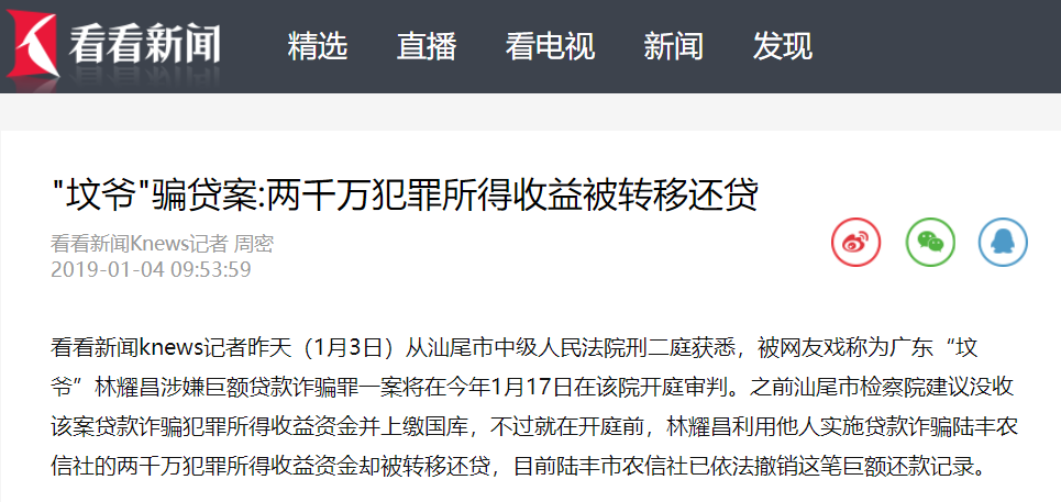 举报后,陆丰市农信社已依法撤销这笔巨额还款记录。林键国称,原定于今年1月17日开庭审判的林耀昌涉嫌巨额贷款诈骗罪一案,才被延迟至5月。“在被审判阶段,‘坟爷’还能将骗贷来的钱拿去还贷,我能不怕吗?”林键国说。 |