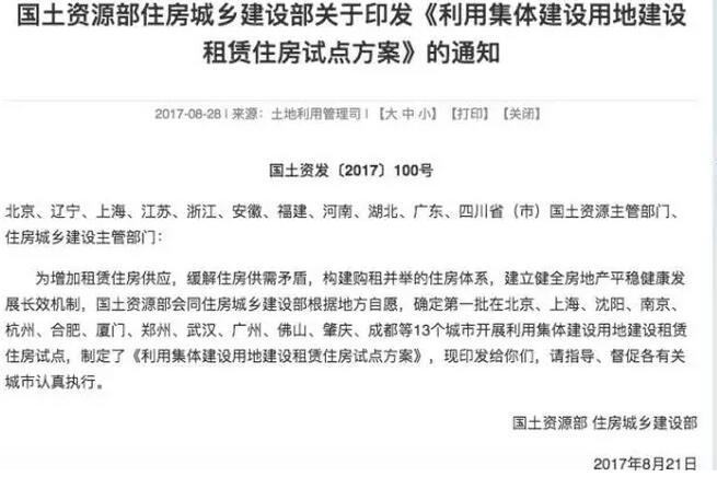| 8月28日,国土资源部网站披露了一则消息,《利用集体建设用地建设租赁住房试点方案》(以下简称方案),提出在“租赁住房需求较大,村镇集体经济组织有建设意愿、有资金来源,政府监管和服务能力较强的城市(第一批包括北京市,上海市,辽宁沈阳市,江苏南京市,浙江杭州市,安徽合肥市,福建厦门市,河南郑州市,湖北武汉市,广东广州市、佛山市、肇庆市,四川成都市),开展利用集体建设用地建设租赁住房试点”。