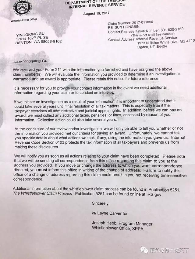 顾颖琼博士的举报信息 AI财经社:为什么想要举报他? 顾颖琼:检举行为在美国是一件很正常的事情,有专门的部门"Whistleblower Office(检举办公室)"负责。凡是你认为对美国利益有损害的人,都有权举报他。但举报规定,个人收入至少二十万美金,公司收入至少一百万美金以上。 孙宏斌在中国开展业务的经营收入和向美国汇报的收入之间是有很大税差的,每一个美国公民都有对国家纳税的义务。国家是由个人构成,你对国家不好,就是在对纳税人不好。 AI财经社:事实认定之后你会有奖励? 顾颖琼:对。美国税务局和联邦调查局联合调查后,所有补交的税,我可以拿到其中的15%到20%,上限是两千万美金。美国是很经典的金钱社会,任何事情都能以美元作为衡量单位,这也是为了鼓励大家举报违法行为。因此在美国举报者很多,匿名举报人也很多,政府会把举报人信息都保护起来。 AI财经社:但你直接实名举报还把家庭地址也贴出来了,不怕有什么影响吗? 顾颖琼:因为这是一封完整的举报信,遮挡某一部分会影响读者对我的信任。在美国,他应该还没有牛到这种程度。