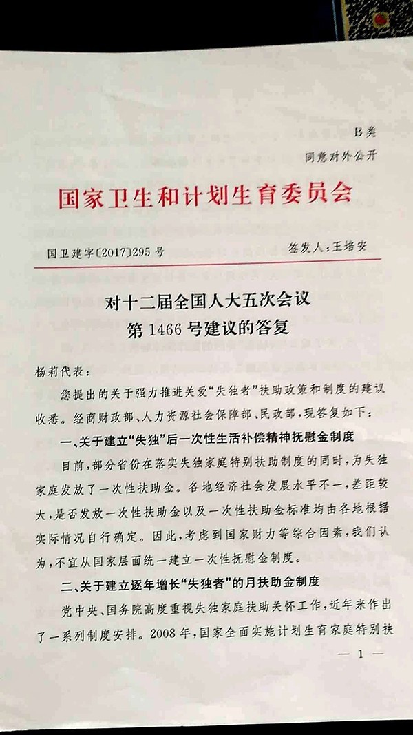 杨莉说,自己是2017年8月收到的国家卫计委的答复信函,对答复表示满意,并将这份答复的内容分享给一些失独家庭。