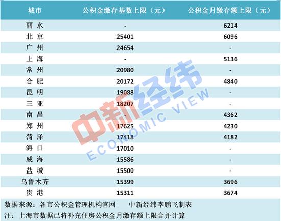 目前已公布住房公积金缴存基数上限或月缴存额上限的部分城市 广州公积金月缴存额上限下降近3000元 据中新经纬客户端梳理发现,一线城市中,除深圳以外,北上广目前均已经公布调整住房公积金缴存基数上限或月缴存额上限。其中,北京每月最多可缴存的公积金最高,达6096元;广州其次,按其公布的公积金缴存基数上限测算为5917元;上海最低,2018年度上海住房公积金月缴存额上限为2996元,补充住房公积金月缴存额上限为2140元,两者相加为5136元。 值得注意的是,2017年曾有媒体报道,根据2017-2018年度住房公积金缴存调整,广州深圳职工月缴公积金最多可超8000元,其中广州最多可缴8910元。而当年同为一线城市的北京和上海公积金月缴存额上限分别为5548元和4684元,被远远甩在了后面。 为啥2018-2019年度广州住房公积金月缴存额上限缩水近3000元? 根据公开资料,2017年,北上广深公积金缴存比例上限均是12%,但北京和上海的缴存基数上限为上一年度全市职工月平均工资的3倍,而广深两地是原则上3倍,经济效益好的单位缴存基数上限可以为5倍。 例如,广州住房公积金管理中心2017年公布的文件规定,经济效益好的缴存单位,职工月平均工资高于22275元的(2016年广州在岗职工月平均工资的3倍),暂可据实申报职工的缴存基数,但最高不得超过37125元(2016年广州在岗职工月平均工资的5倍)。若以37125元为基数计算,广州市单位及职工个人公积金合计每月最高可缴存8910元。 但是,在广州住房公积金管理中心2018年公布的文件中,关于经济效益好的缴存单位,公积金缴存基数最高不超过在岗职工月平均工资5倍的相关规定已不见踪影,仅规定缴存基数不高于广州市2017年城镇非私营单位在岗职工月平均工资的3倍,即24654元。 根据住建部、财政部、央行三部委今年4月发布《关于改进住房公积金缴存机制进一步降低企业成本的通知》规定,缴存住房公积金的月工资基数,不得高于职工工作地所在设区城市统计部门公布的上一年度职工月平均工资的3倍。凡超过3倍的,一律予以规范调整。 不过,今年北京公积金月缴存额上限仍不是最高的。在目前已公布公积金缴存基数调整的城市中,浙江丽水市的月缴存限额达到了6214元,超过北京。 丽水市住房公积金管理中心并未公布这一限额的计算方法,仅表示是根据丽水市统计局提供的在岗职工2017年平均工资数据,经计算综合确定。中新经纬客户端(微信公众号:jwview)根据公开渠道,并未查询到该市在岗职工2017年平均工资相关数据。不过,就已公布的2016年数据来看,该市在岗职工年平均工资为44597元,而2016年北京市在岗职工年平均工资为为92477元,丽水尚不足北京一半。 你的公积金缴存会受影响吗?看工资水平