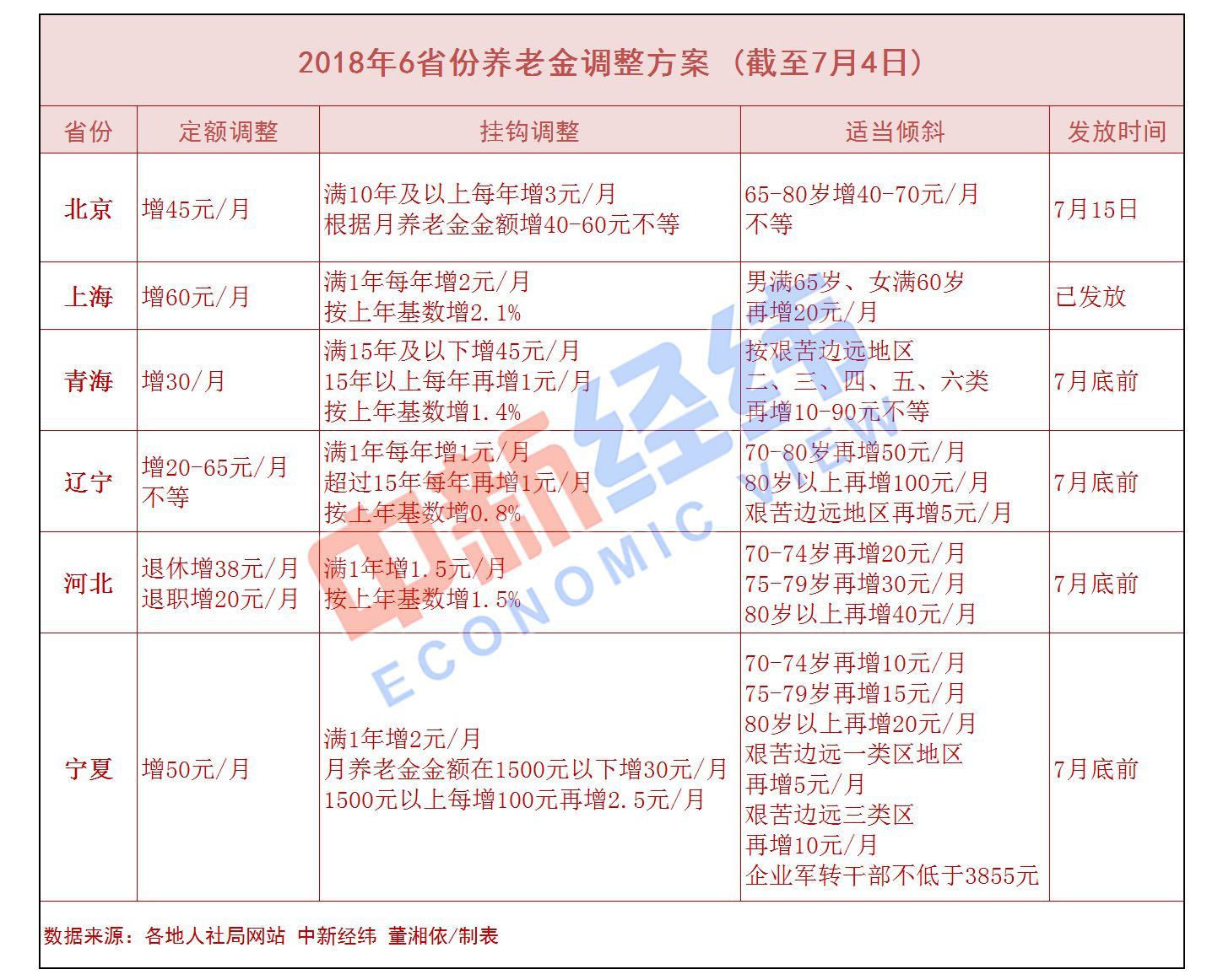 6省上调>> 6个省份宣布调整养老金方案 上海每月涨60元居首 中新经纬客户端梳理发现,目前仅有北京、上海、青海、辽宁、河北、宁夏6个省份宣布调整养老金方案。 考虑到各地调整情况有所区别,以定额调整数来看:上海每个月的养老金涨了60元,排在首位。宁夏仅次于上海,每人每月上调50元。辽宁每个月养老金最低上调金额为20元,这个数字与其他5省份相比最少。 不过,对于在辽宁的80岁以上的退休员工来说,按照适当倾斜原则,其每月可以多领100元的养老金,这个数目则远超另外5省份。 今年能涨多少钱? 1、定额调整--同一地区各类退休人员,调整标准基本一致 举例:上海每人每月增加60元,北京每人每月增加45元,河北每人每月增加38元,青海每人每月增加30元。 2、挂钩调整--简单来说就是"多缴多得,长缴长得" 举例:上海明确,按本人职保缴费年限(含视同缴费年限)每满1年增加2元,不足30元的按30元计算;再以本人2017年12月的基本养老金为基数增加2.1%。 3、适当倾斜--针对高龄退休人员,和艰苦边远地区退休人员等群体的特殊照顾 举例:宁夏规定,在定额和挂钩调整的基础上,对艰苦边远一类区的每人每月再增加基本养老金5元,对艰苦边远三类区的每人每月再增加基本养老金10元。 北京也明确,65至69周岁的退休人员每人每月再增加40元;70至74周岁每人每月再增加50元;75至79周岁每人每月再增加60元;80周岁以上每人每月再增加70元。