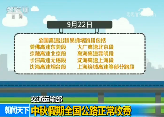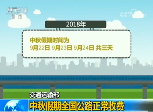 | 交通运输部路网中心昨天(20号)发布2018年中秋全国公路出行预测报告,三天假期全国高速公路正常收费。 2018年中秋假期时间为9月22日、9月23日、9月24日,共三天。