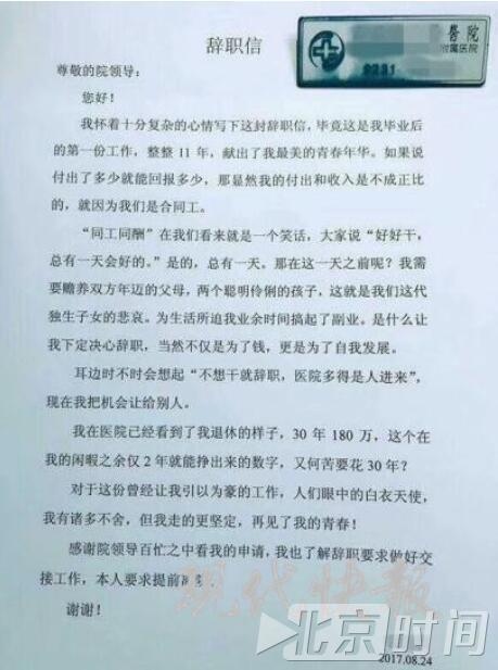 霸气辞职信 朋友圈截图 霸气辞职信:闲暇之余2年赚180 万 在辞职信中,浦某某直言自己是怀着十分复杂的心情写下这封辞职信的,对工作“既爱又恨”。一来,这是自己的第一份工作,整整11年,献出最美的青春年华;二来,质疑“同工同酬”是个笑话,抱怨自己的付出和回报不成正比,全是因为自己是合同工。 第二段中,浦某某坦言自己需要赡养双方年迈的父母,两个聪明伶俐的孩子,为生活所迫,在业余时间搞起了副业。辞职不是为了钱,是为了自我发展。第四段中,浦某某更是既无奈又霸气地表示,在医院看到了自己退休时的样子,30年180万。这个数字,自己闲暇之余仅2年就能挣出,何苦要花30年? 辞职信最后,浦某某以“情怀”结尾:“对于这份曾经让我引以为豪的工作,人们眼中的白衣天使,我有诸多不舍,但我走的更坚定,再见了我的青春!”结尾处态度很谦和,表示会做好交接工作。 无锡中医院:确已收到辞职信,30年180万收入信息不实 现代快报记者注意到,这封“史上最霸气”辞职信为图片形式,右上方为当事人在无锡中医院的工牌,有当事人的名字和工号,右下角也有当事人的名字,落款日期为2017年8月24日。 25日上午,现代快报记者第一时间联系到无锡中医院,院方称浦某某确实为中医院护士,确实在医院工作了11年,并表示24日已收到其辞职信,目前正在走审批流程。院方也与浦某某确认过,浦某某否认辞职信是自己拍摄并上传至社交媒体和网络的。 对于辞职信中提到的“同工不同酬”和“30年180万”,院方表示这与事实不符。院方称医院属于事业单位,工作人员按照相关规定设置事业编制和非事业编制两种,“我们医院收入的高低并不受编制内和编制外的限制,很多编制外员工的收入高于编制内的。另外,在员工的绩效考核以及表彰方面标准是一视同仁的。” 关于提及的利用闲暇时间兼职2年赚180万的说法,院方称,按照医院管理规定,未经医院许可,员工不得在本医院以外的其他医疗机构兼职,在工作时间内不得从事其他与工作无关的行为。院方还透露,前几年微商刚兴起时,医院也曾对员工兼职做微商的事情进行过梳理,以口头询问为主,但排查的结果是没有人表示自己兼职做微商。 至于该员工是否只是利用闲暇时间做兼职,医院正在查实中,如发现员工有损害院方利益的行为将按照相关规定进行处罚。 当事人迟迟不露面,有网友猜测为“微商女神” 随着“霸气辞职信”在网上的持续发酵,网友对“闲暇2年挣180万”的浦某某的身份也有了一些猜测: 猜测一:浦某某是“微商女神”? 有网友百度“浦某某”发现,其号称“江苏微商女神”。据个人简历显示,她开的淘宝店曾在2009年创下年销售100万的业绩,2013年更是达到了500万。 猜测二:浦某某是自我炒作? 如果“微商女神”的身份成立,那么这封辞职信是否是当事人浦某某进行的自我炒作?不少网友均表示出了这样的猜测。 在无锡中医院,现代快报记者向院方提出希望能采访当事人浦某某。院方表示,当事人拒绝接受任何媒体采访。记者又通过浦某某同事提供的联系方式多次电话联系,截至发稿时,浦某某始终未接电话。 |