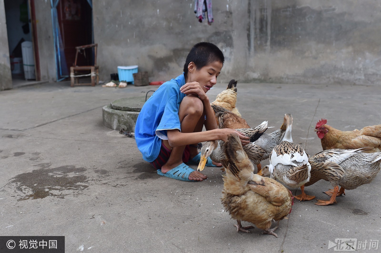 | 午饭时分,在庐江泥河镇洋河村一栋民房的院子里,男孩杰杰蹲在地上,将碗扣在嘴巴上,一只手在划拉着饭。他的身边围着家里养的鸡鸭,吃他掉落的饭粒,而杰杰时不时将身边的鸡鸭拉开,从地上捡起饭粒吃。