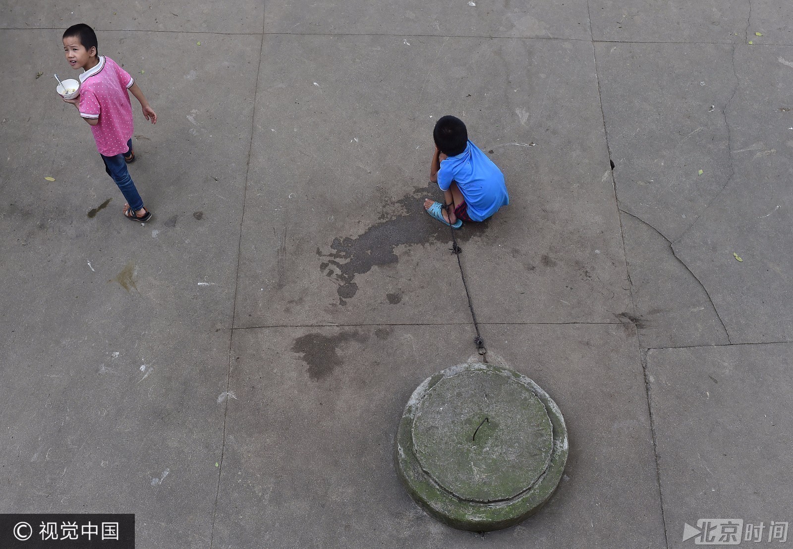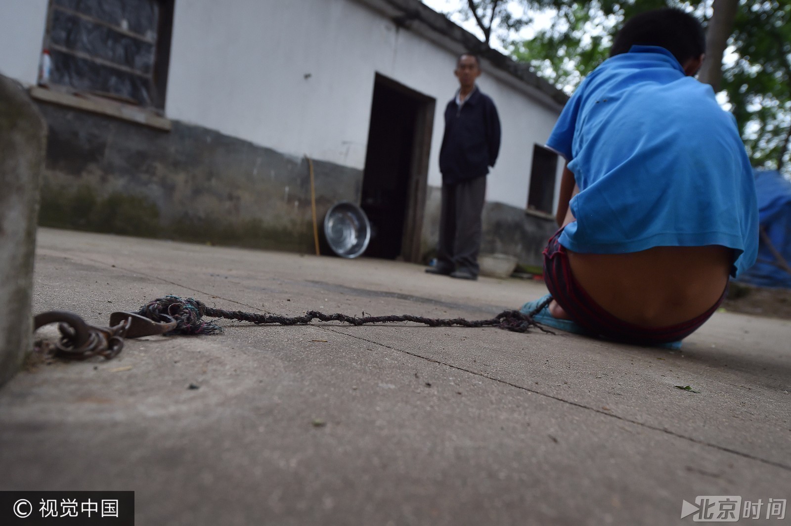 一边,爸爸杨中看着儿子,皱着眉头,不知如何是好。17岁的儿子因为无人照看,为了防止走丢,拴在井边已经十余载时间。