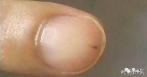 6、黑斑甲 黑斑甲比较严重说明身上可能有肿瘤、坏疽。表示脑部血液循环发生障碍的征兆。一般右手指甲出现,表示左脑有问题。