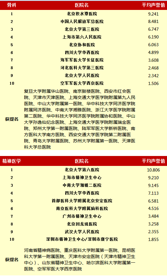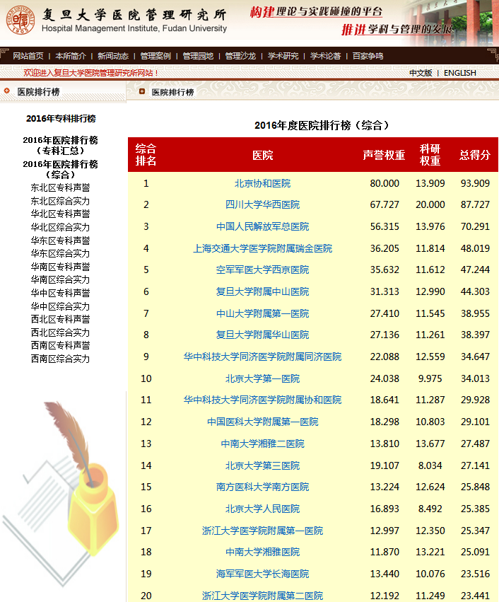 | 【观察者网综合报道】11月11日下午,复旦大学医院管理研究所正式发布了《2016年度中国医院排行榜》和《2016年度中国医院专科声誉排行榜》。在入榜的100家医院中,有37个是专科医院,北京协和医院、四川大学华西医院、中国人民解放军总医院继续名列前三甲。