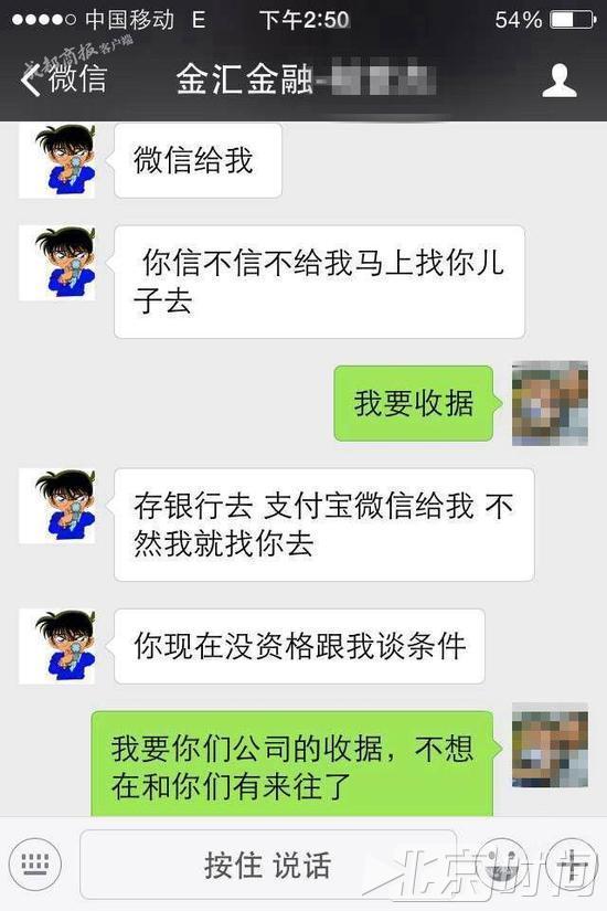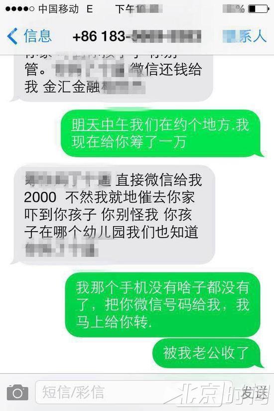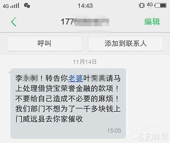 ▲网贷公司以孩子作威胁 “按他们所说,她(叶某)于11月6日在金汇金融贷了4000元,拿到2000元。”李某及叶某的弟弟说,但联系该公司催收人员,对方一会儿说先还4000元,一会又说3万元一次性解决。“但我们喊他们带着凭证来家里拿钱,对方又说来家里就需要10万元才行。就算4000块钱,短短几天,利息也不可能这么高吧。”