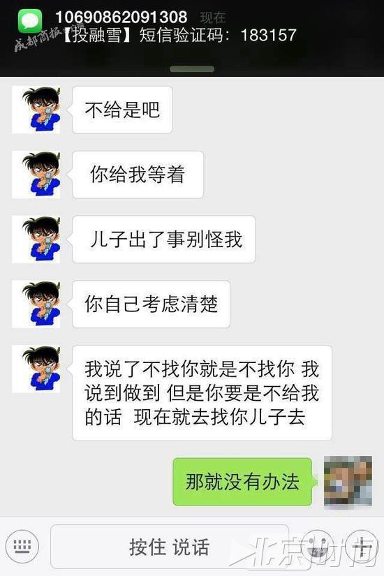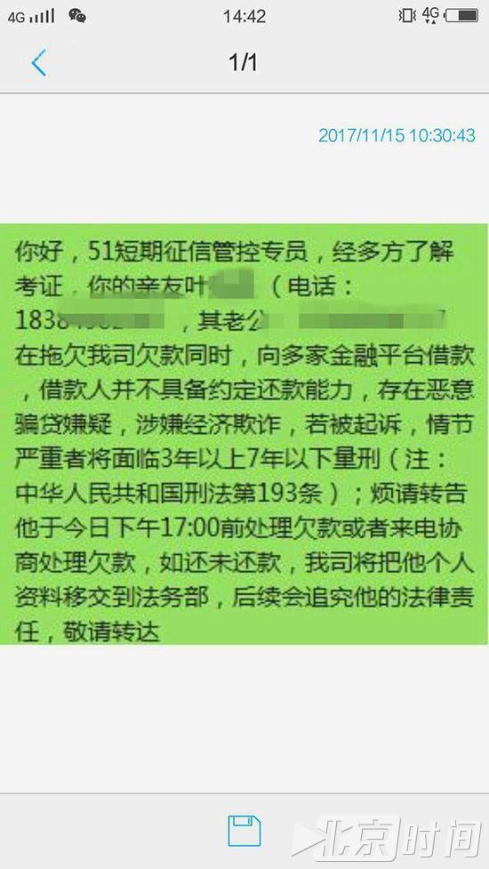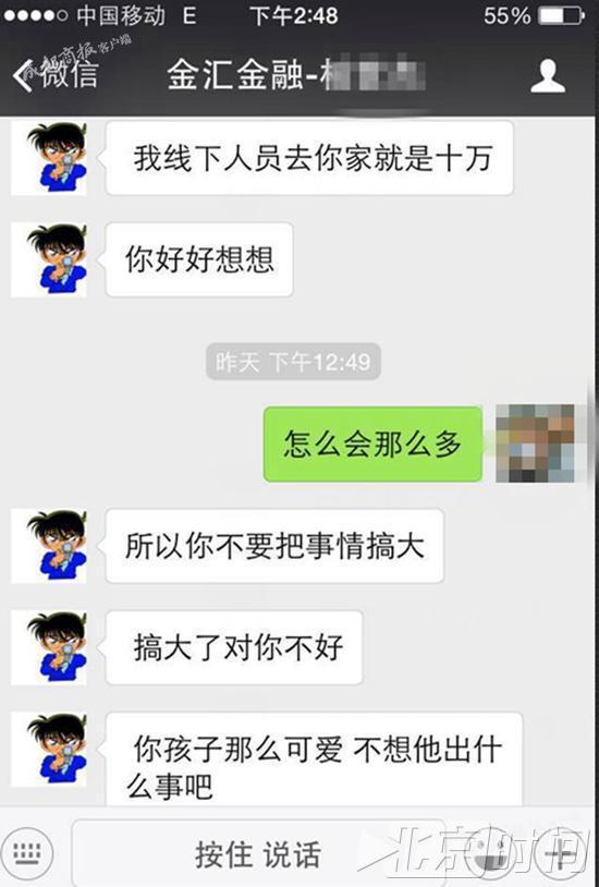 ▲网贷公司以孩子作威胁 “我们没有把她(叶某)自杀的事情告诉他们,他们拿小孩来说事,我们认为这就是威胁和恐吓。”李某说,他们怀疑叶某自杀前,可能遇到网贷公司催收人员催账,而且对方可能存在以家人尤其是小孩作为威胁的“恐吓”行为。“但手机在警方那,里面的内容还没完全解开,我们也不清楚到底有没有恐吓内容。” 目前,警方已介入,具体情况正在调查中。 |